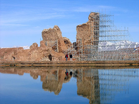 The third temple that Solomon's throne today (functions TAKAB city in West Azarbaijan province) with diverse architectural spaces and natural effects Mermaid is registered in the World Heritage List. One of the important parts of Takht-e Soleiman, Ivan K. which, although part of it collapsed, but Solomon is the largest building in bed. Here is part of the palace of Khosrow II Parviz (or Khosrow I, Anushirwan), which, unfortunately, over time, due to human factors, especially attacks by the armies of the enemy and geographical conditions of the region like the cold and frosts long and earthquakes successive damage is seen.